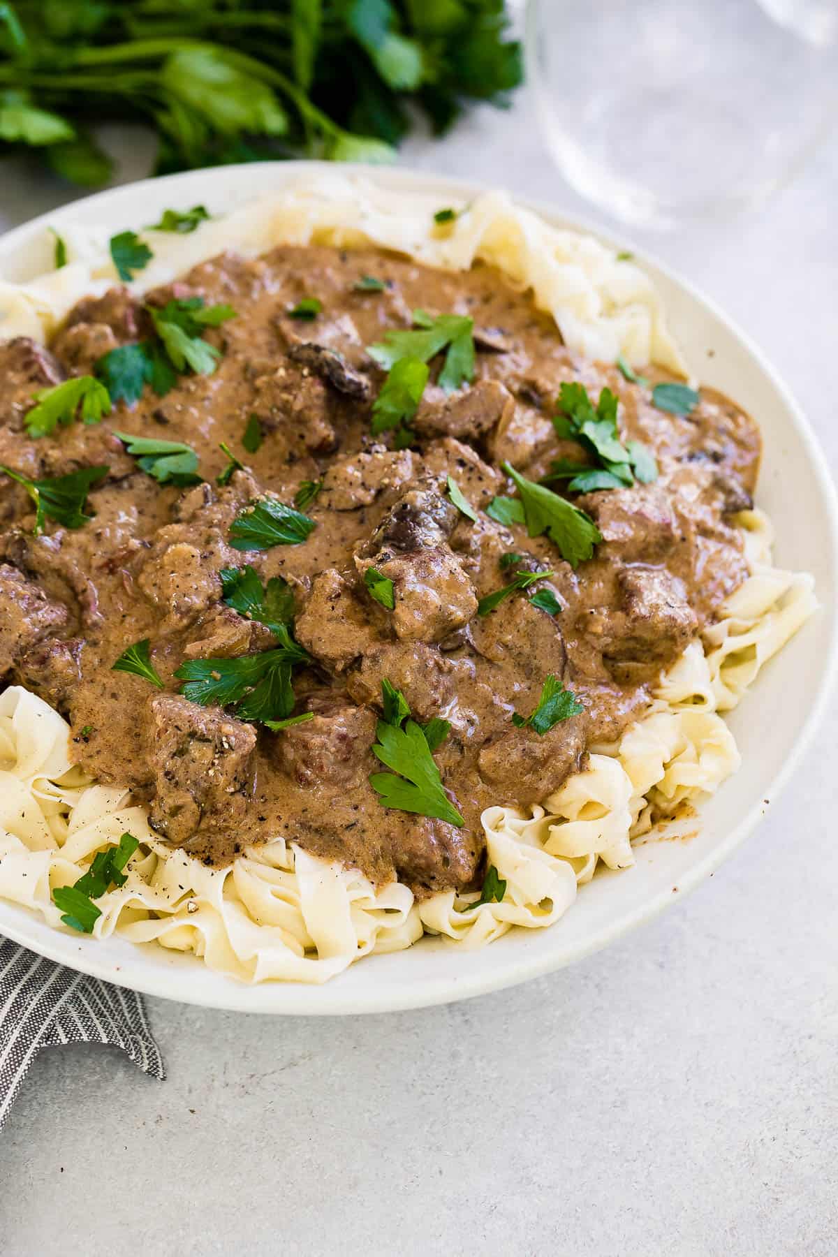 Stir the sour cream mixture back into the pressure cooker with the meat. Season with additional salt and pepper to taste. Serve over egg noodles.
