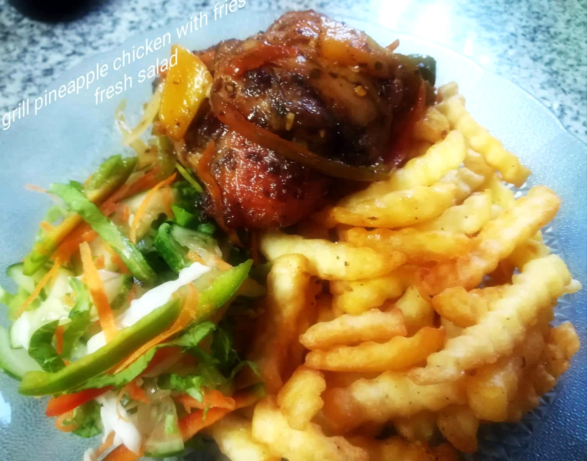 Grill Pineapple Chicken with Sweet Peppers, Onions, Fries & Fresh Salad