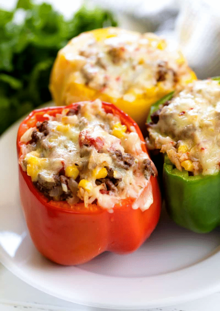 Spoon mixture into bell peppers until full. Sprinkle remaining cheese over the top.